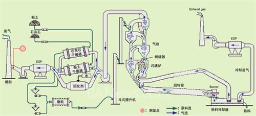 首先将粘土和石灰石等原料烘干、混合均匀,送入碾碎机中制成粉料。这些粉末通入闪速炉中悬浮预热器预热,并进行脱碳,之后在回转窑中煅烧产生熟料。冷却熟料,并与石膏混合,在细磨机中研磨得到水泥。在ESP的下游测量废气中粉尘含量,以保持粉尘排放量在规定范围内。