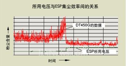 •ESP的集尘效率因电极上施加的电压的大小变化而不同。所用电压越高,集尘效率越高,则出口的粉尘越少。这可通过DT450G监测仪得到。