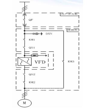 由于项目设计为两套锅炉系统,系统的辅机均无备用,即一次风机、二次风机、引风机每台锅炉均只配备一台,这就造成了风机一旦故障停机,就会对锅炉生产甚至锅炉的安全造成威胁,这就对变频器的性能以及安全性是个严峻的考验。经过现场的考察以及公司的研究,决定采用一拖一自动工变频的方案来解决这一问题,方案主回路见下图: