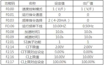◆ 设置F0.14运行频率下限为10Hz,当2个电机需要切换投入使用时,节能控制器会发出指令让变频器运行到下限频率,再让电机投入,这样既可以保证启动平稳,又可以使设备快速到达告诉,提高产量