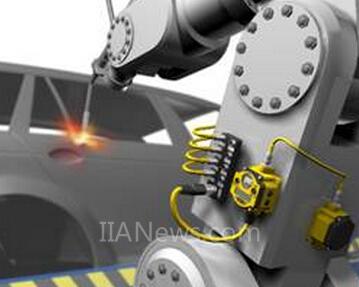 在焊装车间的工作站的机器人手臂携带一个部件抓取夹具,用于将各种部件拾取后安装在车身上某个位置。该夹具上通常会安装携带数个位置传感器、电磁阀等电气设备。这些位置信号、执行信号等均通过电缆线连接到底座上的重载接线盒,再从接线盒经过地面线槽连接到现场总线的输入输出模块。在实际生产过程中,由于机械手臂为了完成抓取、定位以及释放整个过程,在每完成一个工艺内容的过程中可能要数次的来回进行关节运动,姿态转换有时会很大,每天的重复动作频率很高。而通常安装在机械手臂上的高柔性电缆则跟随机械手一起运动。经过长时间的振动与扭曲,高柔电缆的连接口就出现了不同程度的松动,电缆内芯也可能会受到一定的折损。在生产过程中,时常因接口处连接不牢固,夹具上的各种信号就无法准确与现场总线输入输出模块进行正常信号交换,因而导致设备故障,影响生产的正常进行,有可能成为一个造成停机时间多的高故障工位。