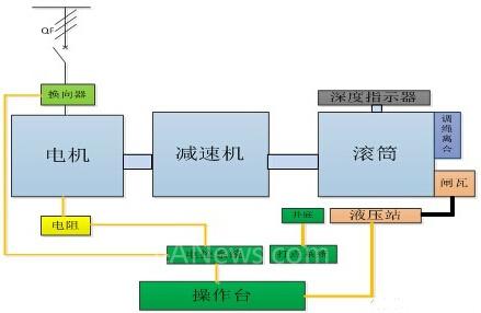 矿井提升机主要由电动机、减速器、卷筒(或摩擦轮)、制动系统、深度指示系统、测速限速系统和操纵系统等组成(如图1),采用交流电机驱动。