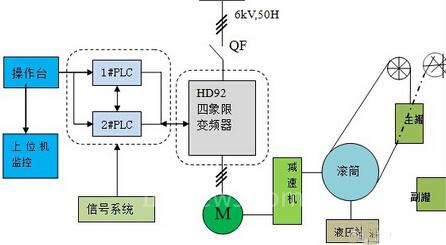 改造内容:原有转子串电阻电控系统及换向切换全部拆除,重新采购一整套新的绞车电控系统,其中操作台采用两台西门子可编程控制器,其中一台为主控机负责提升机的主程序,第二台为监控机负责信号打点、语音报警和后备保护,两台PLC有主有从,互有分工,相互监视实现了安全回路的双线制。使用变频器驱动电机,变频器型号为HD92-F060/500-RN,采用远程控制方式,由操作台的PLC将控制指令传送到变频器,控制框图如下: