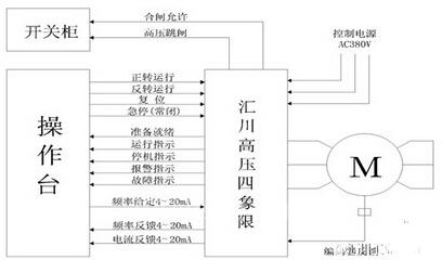 变频器采用两线式控制模式,通过DI9、DI10两个端口分别控制变频器正、反转,频率给定采用4~20mA模拟量信号,对应变频器输出频率0~50Hz,变频器开关量输入:10路,继电器干接点,包括起动、停止、手动/自动转换、复位等信号,开关量输出:16路,继电器干接点,包括变频器高压就绪、变频器运行、变频器故障、变频器停止、变频器保护动作等信号;