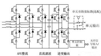 功率单元采用三电平拓扑结构,中心点采用二极管钳位,整个功率单元由AFE整流、直流滤波、逆变三大部分组成,功率单元拓扑结构如下: