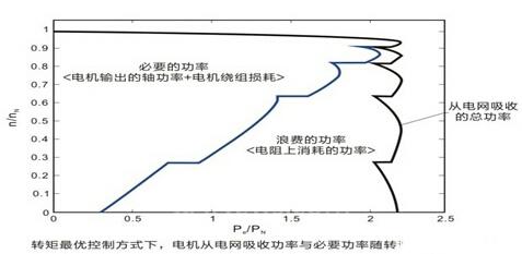 7、节能: 对于恒转矩类负载,功率与转速近似成一次线性关系,即P=K*T*N,从下图中我们可以看出,传统利用转子串电阻调速的方式,在电阻上消耗了大量能量,如采用变频调速装置改造后,可节省在电阻上消耗的全部能量。原有的转子串电阻调速方式,在启动和停止过程中,有大量的转差功率消耗在电阻上,造成电能的极大浪费,采用变频器调速后,可将这部分能量全部省掉。通过现场抄表比较,相比之前的串电阻调速方式,变频改造后可节约电能大约15%;