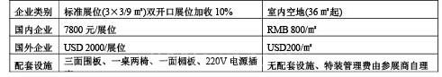备注:标准展位:包括(3M×3M)展位(三面围板、楣板、一桌二椅、220V电源插座、照明、清洁费等)