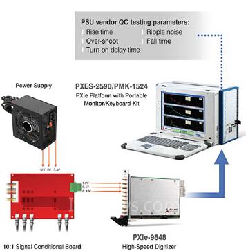 凌华科技PXIe-9848领先的性能为电源测试应用提供诸多优势。14位高分辨率可测量极微小的μV等级噪声,100 MS/s的高采样率及100 MHz高带宽的特性可测量到μs等级极快速变动的上升时间,并可轻易满足其他电源供应器特性参数量测,如过冲和开机延迟时间等采样需求。