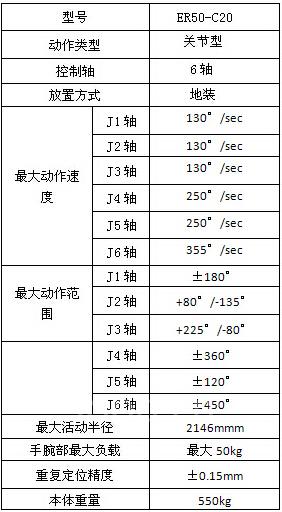 本次项目所使用的50kG六关节工业机器人是国产最新型号,具有结构紧凑,关节速度较高,动态响应快,精度高,过载能力强等特点。电控系统采用总线结构,扩展应用方便。适用于搬运,激光切割,打磨抛光等场合。其产品性能如下表所示: