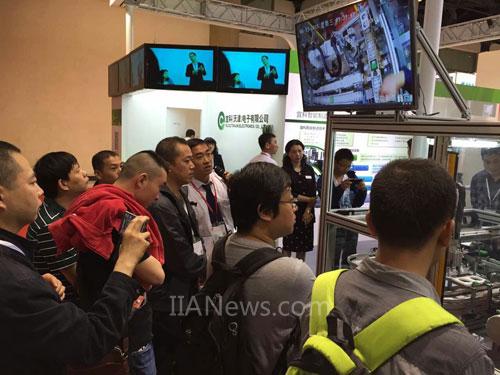 展台的另一端,智能制造解决方案微缩生产线也吸引了众多目光,这是该生产线自升级以来首次在北京展示。希望了解机器人在系统中作用的观众最多,行业经理介绍道:“机器人的主要工作是根据系统下达的生产指令进行上料、装配,后续配合循环演示,机器人还会对演示工件进行拆解工作。在实际的现场应用中,机器人可以满足自动上下料、装配、焊接、检测、分拣、码垛等现场作业,带来包括减少工人作业强度、提高质量及产量的稳定性、最大化提升生产效率等诸多利好。”另外,此次展会宜科公司带来的全新微缩生产线包括智能化仓储系统、机器人自动装配检测、智能输送系统、通用自动装配系统、制造执行系统(MES)、数据采集与追溯系统(视觉、RFID)等几个主要的功能模块。很多业内观众对MES系统可以为企业带来的价值产生极大的兴趣,宜科产品经理为其详细解说:“MES系统能够为企业解决生产现场的各种管理问题,从复杂排产运算到物料的供应配送,MES系统均可以实现数据的实时监控,使整个生产过程更加精益、透明,大大提高了生产效率,节约了人力成本。”同时,在全新微缩生产线中视觉处理系统也成为观众关注的焦点,宜科视觉产品包括智能相机以及数字相机两大系列产品。本次为机器人配置了采用数字相机的视觉处理系统,主要针对机器人焊接工序提供智能检验工作,数字相机对机器人焊接的电路板焊点进行拍照,并上传到视觉处理器进行比对处理,用以检测焊点数量及质量,相关检测信息直接汇总提供给MES系统进行质量分析及记录,这也是视觉系统的重要作用之一,未来结合客户现场的实际需求还将开发出更多功能。