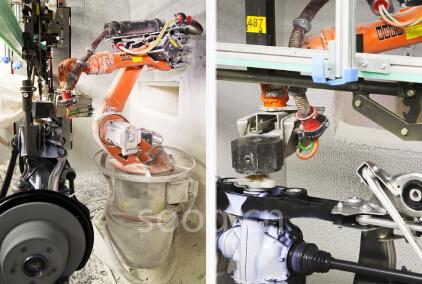 后轴悬挂在一个运输装置上并与输送带同步传送到涂漆室。涂漆室内装有两台持续为驱动轴左右侧涂漆的机器人。这两台面对面放置的机器人,是真正实现创新的最大功臣:KR 16-2 空间需求小,提供理想的负载能力、作用范围和防爆功能,用于旋转变速装置的驱动轴。