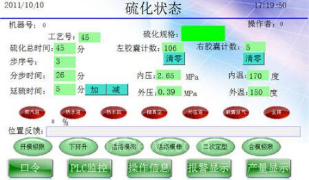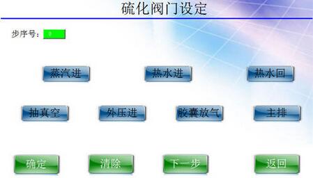 步序号显示正在进行的硫化步序。分步时间以倒计时方式显示该步序时间。“位置反馈”的上方有一排指示灯显示步序号对应的硫化阀门状态。