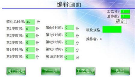 首先输入工艺号(00-99),然后根据不同的工艺设定硫化规格和分步时间,再输入总步数,按下“确定”键就会自动累加出“硫化总时间”。