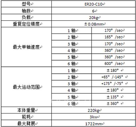 本次项目所使用的20kG六关节工业机器人是国产最新型号,具有结构紧凑,关节速度较高,动态响应快,精度高,过载能力强等特点。电控系统采用总线结构,扩展应用方便。适用于切割、打磨、上下料等场合。其产品性能如下表所示: