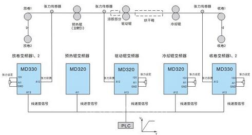 各级张力控制全部由变频器完成,张力反馈使用张力传感器。PLC(或同步控制器)控制驱动辊变频器速度,同时做为其他变频器的线速度信号。