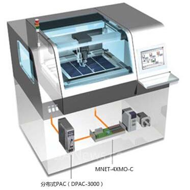 凌华的DPAC是一种分布式可编程自动控制器平台,并配有高速、实时的现场总线-Motionnet总线和HSL总线接口。凌华的DPAC-3000作为一个紧凑型(162×150×50)且强固的控制器,能够搭配各种HSI I/O与运动控制模块来整合点胶机应用。凌华DPAC-3000能够通过五类线(CAT-5)电缆实现高速数据通讯,这有效地节约了配线成本。通过结合凌华MNET-4XMO运动控制模块的预装载缓存功能,能够提供连续的运动控制以确保满足点胶机对于轨迹控制的要 求。MNET-4XMO-C能够提供实时位置比较及最高100KHz的触发输出。