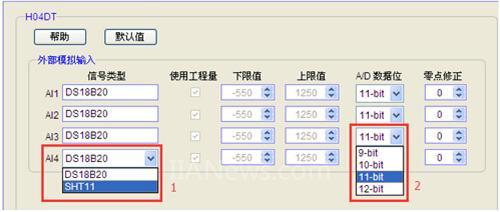扩展模块选用4路的温湿度模块H04DT,既可以接数字温度传感器DS18B20,也可以接传感器SHT1x(SHT7x),其中DS18B20测温范围为-55~+125℃;传感器SHT1x(SHT7x)既可以测温度也可以测湿度,温度范围-40~123.8℃,湿度0~100%RH。支持多种类型的转换精度,转换精度9-12位。本例由于只要测温度,故选择DS18B20传感器。