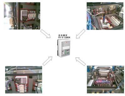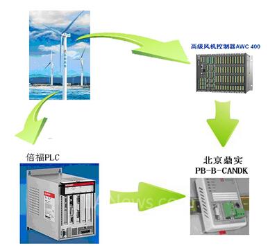 风力发电机组有风轮、传动系统、偏航系统、液压系统、制动系统、发电机、控制与安全系统(主控系统)、机舱、塔架和塔基等组成。北京鼎实的PB-B-CANDK作用主要是实现塔基主控系统与机舱可再生能源控制系统的通信。其中,塔基主控系统包含主速度控制器和变流、逆变器。主速度控制器采用的是倍福公司的可编程逻辑控制器(PLC);可再生能源控制系统采用丹麦DEIF的控制器AWC400。这是机舱控制柜的主要部分,其它还包含交、直流伺服驱动控制器等。