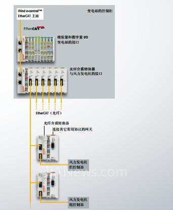 一个EK1100 EtherCAT 耦合器链接控制站中的 I/O 层。种类齐全的 EtherCAT 端子模块可处理风场自动运行中出现的所有信号形式。另外一个 EK1100 耦合器与各个 EK1521 EtherCAT 光纤扩展端子模块通讯。与带光纤接口的 EK1501 EtherCAT 耦合器配套,它们在各个风力发电机组间建立了灵活、可扩展的光纤网络。标准以太网电缆允许两个站点之间的距离为 100 米,两个光纤装置之间的距离可以更长:使用多模玻璃光纤连接可达 2 公里,而使用单模玻璃光纤连接甚至可达 20 公里。
