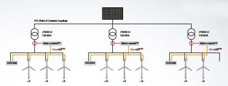 Wind e-control™ 系统用于每个变电站,确保风场中各个风力发电机之间的 EtherCAT 数据传输安全