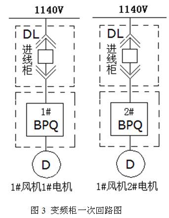 正兴煤业九鑫矿主扇风机为两台,一用一备。风机电机变频器采用一拖一控制,风光中压变频调速系统由一次回路进线柜、变频单元柜组成。变频运行时,变频器为电机提供全面的保护。如果变频器在运行中出现故障,立即将备用风机投入运行,保证煤矿通风生产要求。1#风机中压变频器柜一次回路如图3所示。