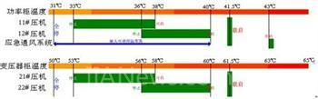 装置根据变频器功率柜和变压器柜柜顶排风口的温度检测信号,实现变频器箱体内环境温度控制,将功率柜内的温度控制在30~38℃和变压器柜内的温度控制在53~58℃的一个宽带范围内。当变频器功率柜顶排风口温度测点2的信号到达38℃时,启动其中的11#压机工作;当变频器负荷过高,单台压机不能维持变频器功率柜温度稳定时,电控系统在41.5℃自动启动第二台12#压机。温度在控制过程中仍不能达到温度稳定的,功率柜温度上升至43℃时,自动打开应急通风系统,进行开放式循环。