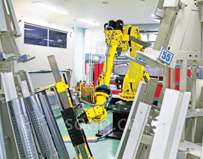 重田社长:滚筒的制版工序要用到刻蚀和电镀作业所使用的化学药品。根据药品不同,有的会对机器人及伺服电机造成不良影响,因此在这个领域一般很少使用机器人。我们通过对机器人手抓采用钛合金材料,并对腐蚀性气体及排水泄漏的保护做了相应的设计,从而在最大程度上实现了对机器人、伺服电机以及操作人员的保护。我们所有的新员工都要在FANUC培训中心接受机器人的培训。在制作制版系统的过程中不断模索,根据需要对机器人进行更为细致的示教,如使滚筒倾斜去除水分避免药液滴落,以及将接收盘中积存的药液丢弃到指定处等。