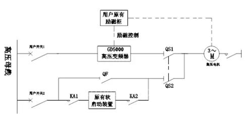 变频运行时,QS2断开,QS1闭合,变频器上电时,用户开关闭合,经过约15秒延时后,励磁装置向同步电机投入励磁电流,然后从现场向变频器下达“启动”命令,变频器按照预设的逻辑向同步电机输出电压,同步电机起动。