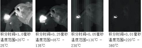图1 - 4:极端温度下的一组焊接连续镜头:积分或曝光时间越短,温度范围就越高,黑色或噪点区域也越大。