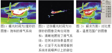 相反地,曝光时间为30微秒的图像没有任何饱和,清晰地展现了排气系统,但其余的场景温度过低,以至于无法清楚看到系统本底噪声以上的部位(图2)。