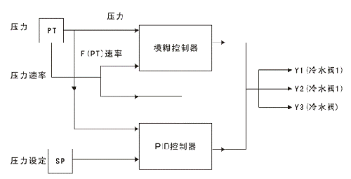 内冷系统是为了保障系统超压的有力手段,一般压力在3.45Mpa之后,主要是在压力快速上升时,而分程控制阀已全开时开启内冷阀。针对其特点,在设计系统时,当压力大于3.45且分程冷水阀开度大于75度时切自动。及时投入调节。