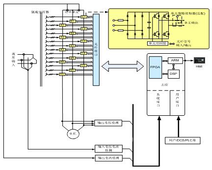 功率单元采用三相交流输入,整流滤波后形成直流电压,经IGBT的H桥逆变后输出脉宽调制(PWM)电压。功率单元控制板由IGBT驱动电路和监测保护电路、光纤通信电路、单元旁路电路和控制电源组成。运行中功率单元故障时,变频器可将故障单元自动旁路并继续运行,等情况允许时再停机排除故障。(其中单元旁路功能为选配,用户可根据实际需要选择)
