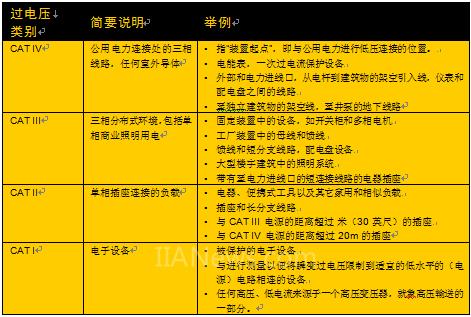 过电压安装类别。IEC 61010 适用于低压 (< 1000 V) 测试设备。CAT IV
