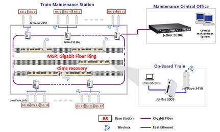 而基站内装置的JetWave 2450无线AP设备将采集数据传送至JetNet 5010G千兆交换机,经由交换机转发所有信息至维护站的中央监控控制中心。Korenix工业交换机JetNet 5010G配有千兆 SFP Combo端口并支持Korenix专利MSR网络冗余技术,交换机能组成光纤环网、可靠的扩展信息。Korenix专利冗余技术MSR,提供简单网络架构,和一个非常快速的断线恢复时间(<5ms),能确保不掉包、实时的数据传输。