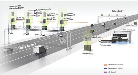在全国各地的公路系统上超过150个门架上都安装了模块化的机柜。每台机柜中,都有一个摄像头和车辆检测装置与EDS-G509-T(或EDS-510A-3GT-T)工业以太网交换机相连。这些交换机都可构建千兆网络,以满足大量数据和图像传输的需求。不仅如此,他们还配置了IGMP snooping来优化带宽使用率,降低网络拥堵。EDS-G509-T配有5个光纤端口,可为ITS网络提供长距离的传输。