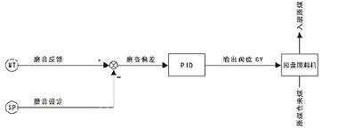 根据磨音反馈的大小与设定值进行比较,由PID调节器输出控制量改变圆盘喂料机进料速度,从而达到磨音控制的目的。系统在任何情况下进行手动—自动切换而不产生扰动。