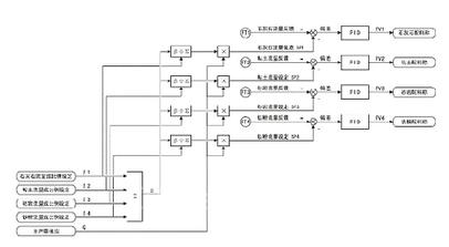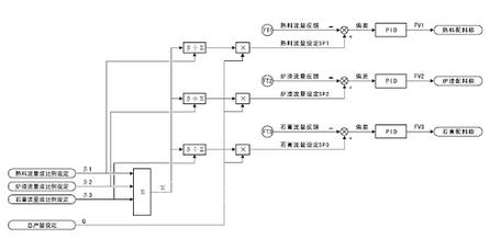 控制原理与生料配比相同。根据需要,设定好熟料、炉渣和石膏配比,操作员只需给出产量要求,系统自动根据产量和配比进行控制,达到控制要求。在任何情况下进行手动—自动切换而不产生扰动。