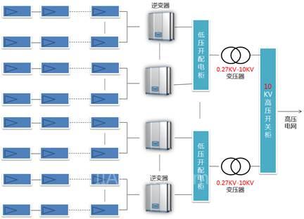 项目系统选用了台达屋外型壁挂式太阳能逆变器,单台功率20KW、转换效率98.3%、IP65防护等级。系统总计使用了100台逆变器安装于两个园区的10个大棚,汇集成2个独立的1MW单元升压至10KV并入当地电网公司电网。其系统架构图如下: