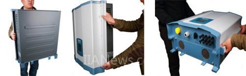 首先,产品外形充分满足了人体工程力学设计,两边设有便于安装及搬运的手握横条,单独安装时,安装人员可两手抓住两侧横条抬起挂装;两个人搬运时,可利用两侧横条握住的方便性,轻松横着抬走;机器底部设有底座和凹槽,可以直立于地面而不损坏接线端子,需要抬起时,一手放入凹槽处、一手抓住侧边横条,方便两人抬起机器,安装非常方便。这与同类厂家设备相比,预计约节约1/3的系统安装时间。见图如下:
