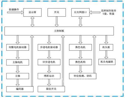 电脑绣花机的基本功能就是通过控制各电机协同配合工作,在布料上按照花样数据形成针迹完成刺绣过程。花样文件可以通过如软盘、U盘等存储介质拷贝到控制系统内部的存储器中,控制系统根据花样的要求来控制电机及其检测机构,使其协同工作,完成绣花功能。绣花机工作时,主轴电机通过传动轮带动针杆上下运动,而X轴和Y轴的步进电机带动着绣框在X、Y轴方向运动,刺绣品随绣框运动,从而刺绣出图案。当需要换色时,主控制器通过控制换色电机转动,通过换色机构带动换色杆移动,将穿有其它颜色线的针换上,继续刺绣。电脑绣花机控制系统由主控电路和外部设备构成,控制系统的结构框图如下。