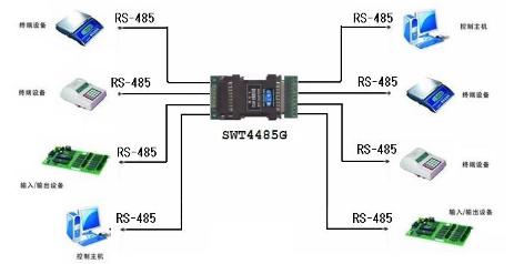 SWT4485G的每侧的4个RS485 口都可以接入RS485总线,就相当于是可以每一边开4个RS485的叉路。SWT4485G的各个上位机RS485 口(0、1、2、3 号)功能是完全一样的、可以互换;同理,SWT4485G的各个下位机RS485 口(4、5、6、7号)功能是完全一样的、也可以互换。使用SWT4485G组网后,无需修改软件也无需设置,也不影响其它节点的正常通信!注意每一条RS485支线都需要支线两端接终端电阻,