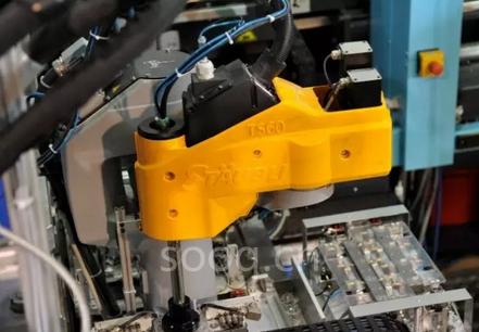 TS60 Scara机器人将接触件置入缓冲器中, RX160六轴机器人进行注塑机装卸载