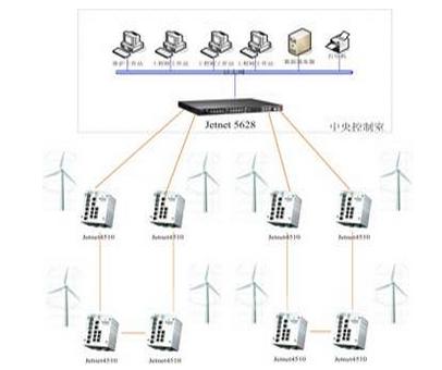 位于国内北方有多处风能发电区,当地属中温带大陆性季风气候,地域辽阔,干燥少雨,风能资源丰富。当中一处,其应用为中央监控系统采用korenix(科洛理思)多光口的模块化工业交换机 JetNet 5628G,加上10口网管型工业交换机 JetNet 4510建成不同规模的相切环型网络。采用此种网络架构,既保证了中央控制室对现场风机SCADA监控系统的稳定性及可靠性,又实现现场风机管理的易于维护性。