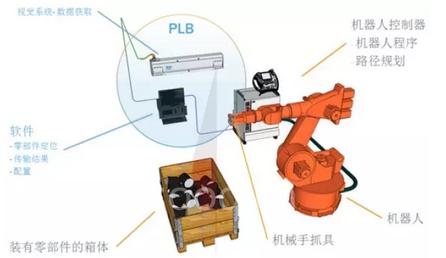 PLB 主要用于箱体中零部件的定位,它包含一个用于获取高质量图像数据的3D 相机,和用于3D图形匹配的零部件CAD 文件,以及用于机器人集成的工具。它的作用就是使机器人拾取箱体中的物体。