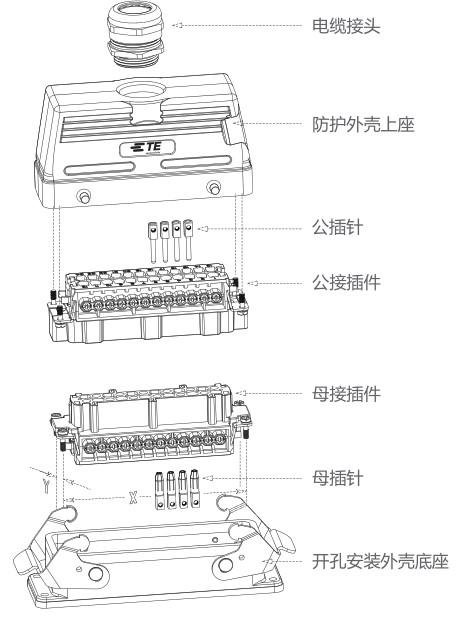 重载连接器包含了3个重要的组成部分:插芯,针件及外壳。插芯和针件组成一个电气模块,为设备提供电气连接,而外壳由金属或热塑材料制作而成,结构强壮,能够为电气连接提供可靠的机械及环境保护。而金属外壳的防水防腐蚀特性则保证了 TE 的重载连接器能够在恶劣环境下工作甚至满足客户的户外连接需求。
