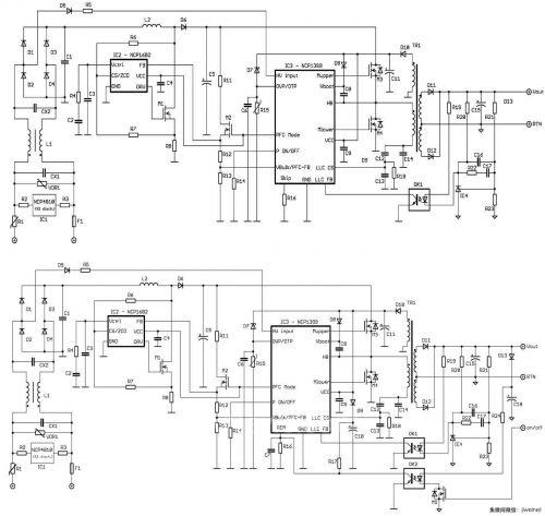 图2. NCP1399典型应用原理图(上:A版本;下:B版本)