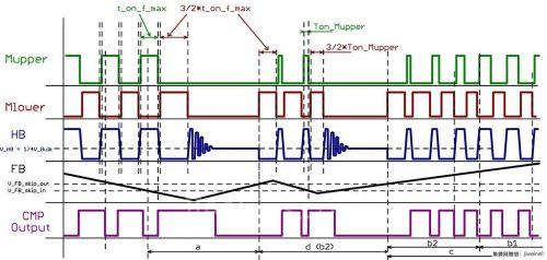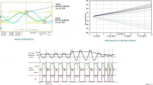 由于谐振电容集成初级电流(Iprimary),所以Vcs电压与初级电流成正比,而在关断期间,Vcs电压有正或负斜率,再者,关断时的Vcs电压几乎是线性地依赖于负载电流,而Vcs关断电压曲线随Vbulk变化,故可通过Vcs与初级电流的关系以及Vcs分压实现电流模式LLC控制。具体控制算法为:1)通过Vcs分压信号取得正谐振电容斜率;2)偏移加至Vcs分压信号,以避免轻载时光耦饱和;3)根据FB引脚电压和Vcs电压斜率(反映通过初级电流的线路和负载条件)通过系统自动调节Mupper导通时间;4)然后同样的导通时间被复制用于Mlower MOSFET,确保完美对称的直流。
