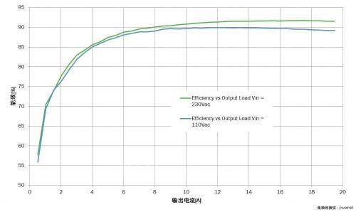 下图显示,当输入电压为110 V和230 V,输出电流在0-20 A范围内时,NCP1399的能效高达90%以上。