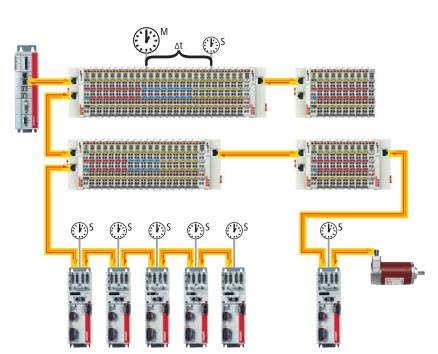 传统现场总线无法与基于 PC 的控制技术相匹配。因此,如果选用了慢速现场总线或工业以太网系统,则除了高性能控制器外,还常常需要额外采用部分专用控制器和调节器对数据进行局部预处理。这些控制器的编程和配置必须单独地进行。在半导体制造厂中,专用的液压控制器、集成式驱动定位控制器或质量流量控制器即是典型的实例。这些需要使用大量硬件和工具,强制性地推高了采购、工程设计和维护等方面的成本。分布式本地控制器对于模块化机器来说可能代表着久经测试,但是,在大量应用中,它们仅仅只是通信瓶颈的必然产物。利用 EtherCAT 和 TwinCAT,也可以在总线上构成封闭的极速控制回路:复杂的专用控制器及其专用编程工具变得多余,且可以替代为高速 I/O 终端和 TwinCAT 控制器功能块。这不仅减少了成本;而且,还打开了专用控制器的“黑盒子”:必要时,机器制造商或系统集成商可以针对自己的应用,对控制器软件进行优化,甚至于将其彻底替换为自己的控制算法,从而在竞争中脱颖而出。对于 TwinCAT 3,用户也可利用 Matlab®/ Simulink® 或 C/C++ 从容地开发这些算法,并对其进行在线调试。