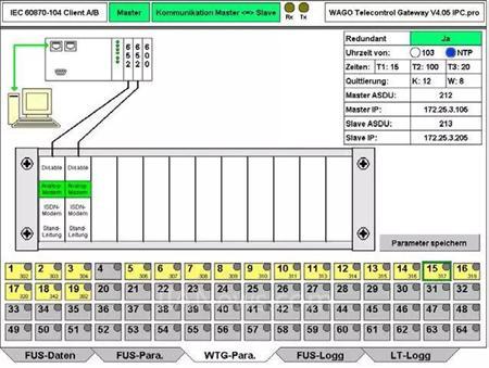 通过TCP/IP连接可以将网关连接到控制系统。此外,汉堡水务局还依据IEC60870-5-101标准将19个WAGO远动控制器(750-880/025-001)作为子站连接至控制系统:其中14个通过模拟量拨号连接,4个通过GSM,另外一个则是基于ADSL(现有控制技术拥有一个冗余的前端计算机系统,可直接使用IEC-104协议)。